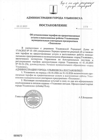 Тарифы на предоставляемые услуги и выполняемые работы УМУП «Теплоком» на 2026 год, установленные Постановлением Администрации города Ульяновска №1378 от 08.12.2025г.